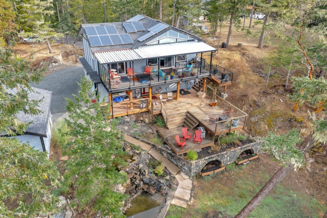 Active Welcome to Nature’s front door. Experience the tranquility of nature from your private, nearly 1200 sq ft deck on this stunning property backing onto East Sooke park and retaining its natural rugged beauty. Built in 2016 and sporting many system updates including a 36 solar panel system, 9 kw generator, heat pump, a beautiful propane fireplace, heated flooring, a 2100 gallon cistern and a separate 19×20 garage/workshop.