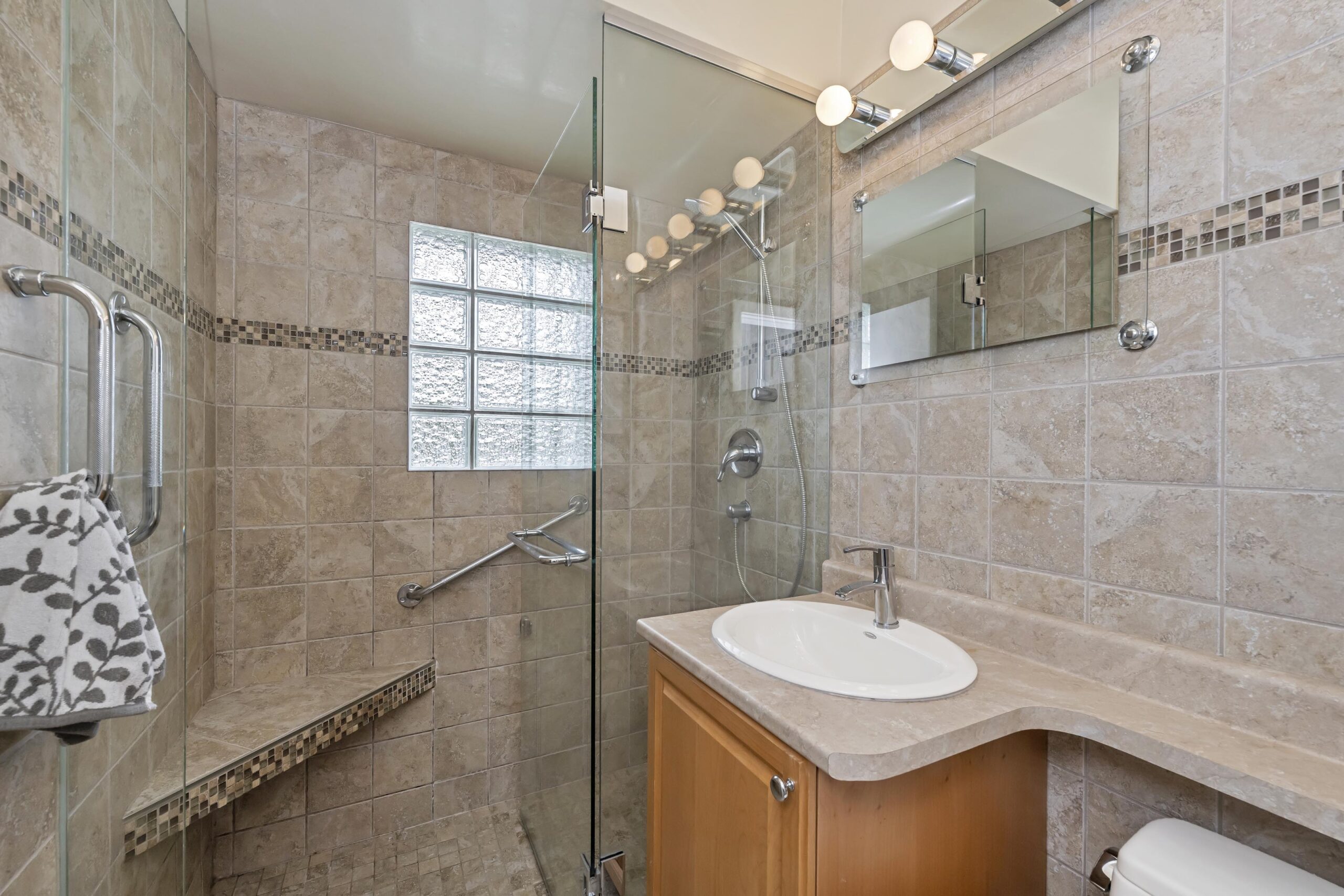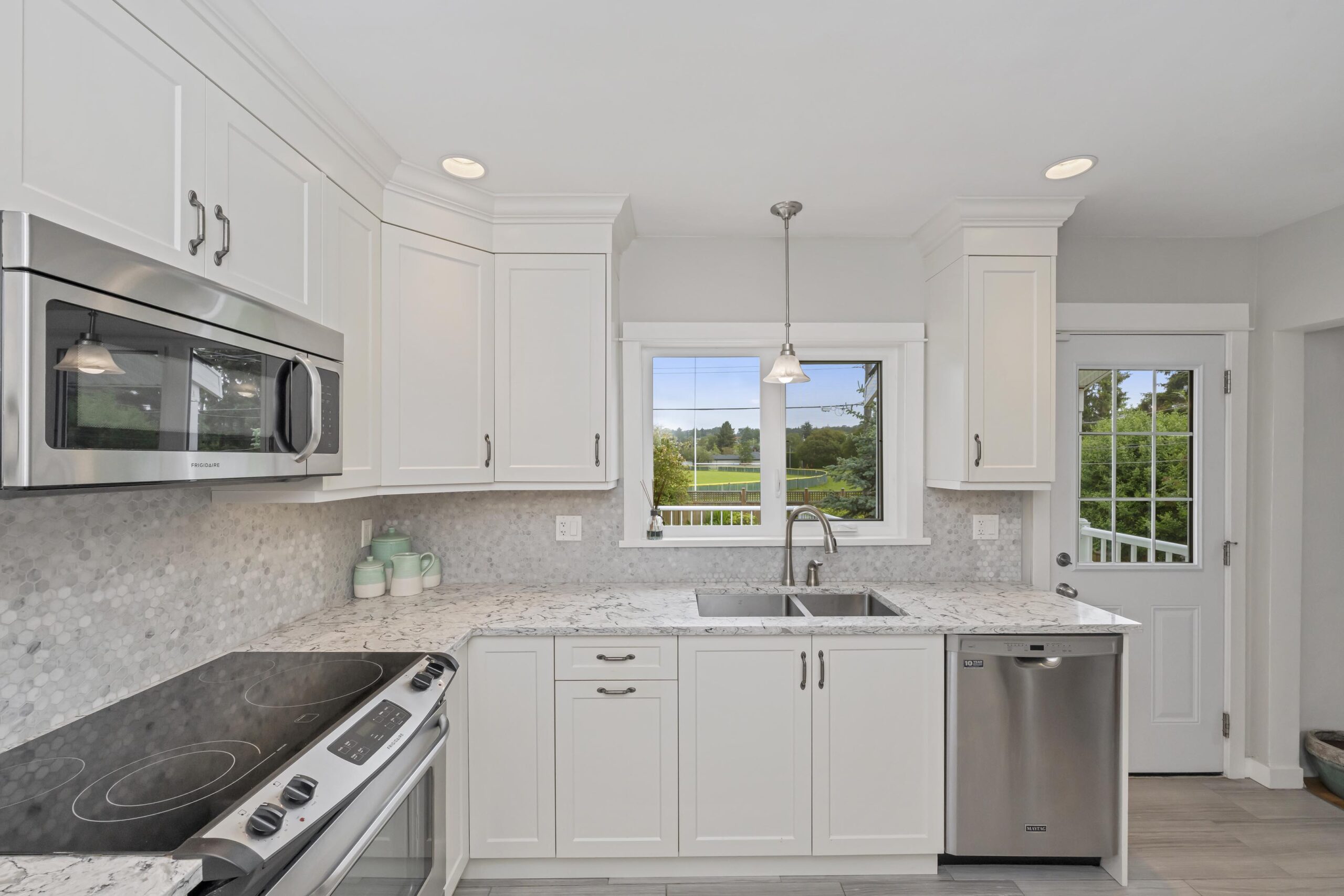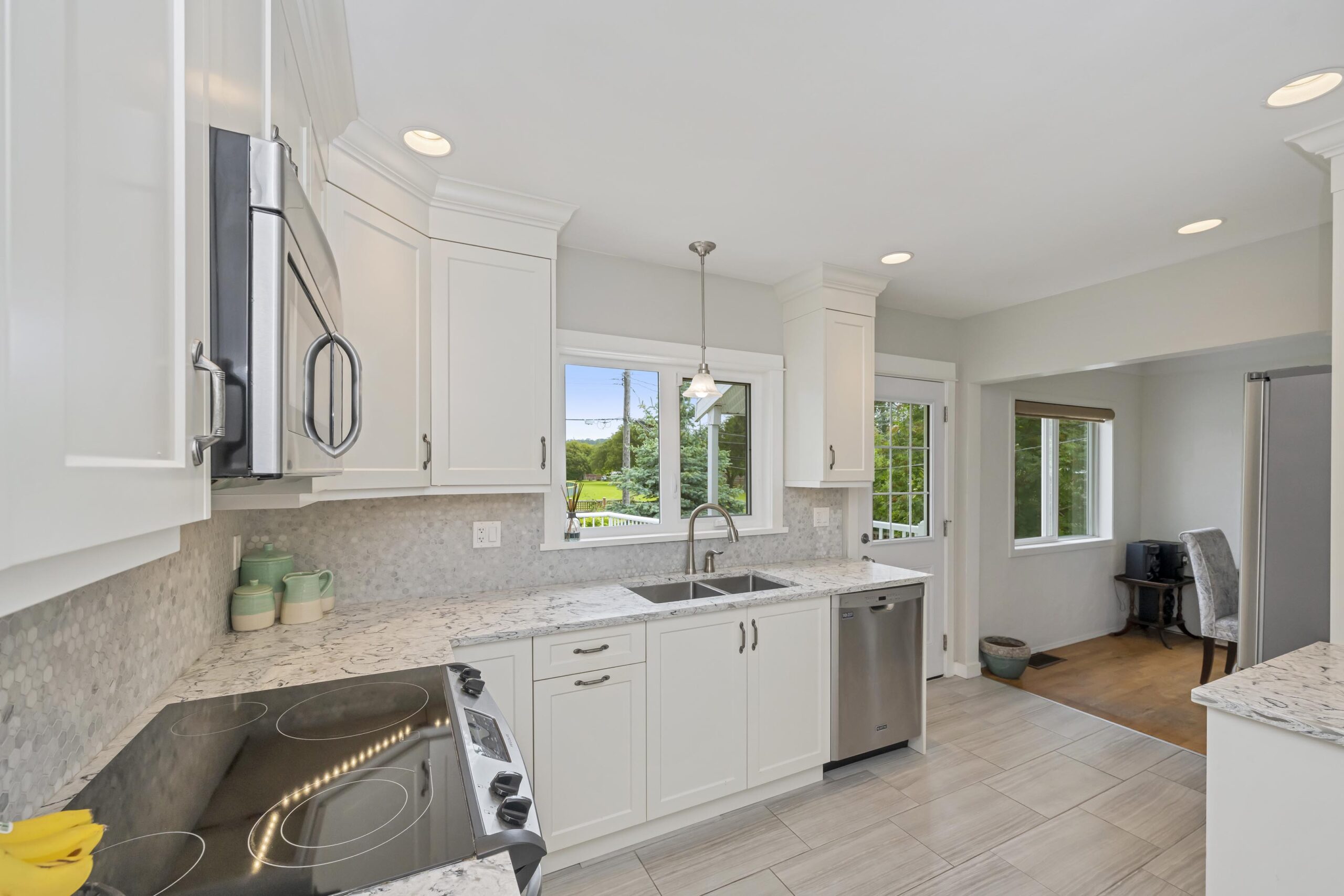 Now I’d like to introduce you to the best of the new. The windows have all been updated, this home features a gas furnace, gas hot water heater, gas insert fireplace, a beautifully updated kitchen with modern quartz counter-tops and stainless appliances, and the main bathroom is inviting, contemporary and delightful in its artisan tile work.